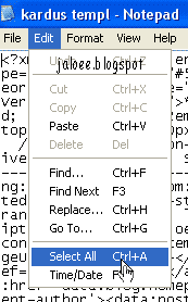 3. Setelah Templatenya terbuka dalam Program Notepad,  klik menu Edit -> Select All.  Kemudian klik Copy.