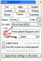 4. Langkah yang terakhir. pada Movie Panel kita pilih tab Scene kemudian di samping tulisan On Click pilih : Go to link (url). dan pada kotak kosong isi alamat (url) blog kita atau alamat (url) feed. artinya ini jika kita menekan banner ini maka akan menuju pada halaman depan blog atau feed kita.