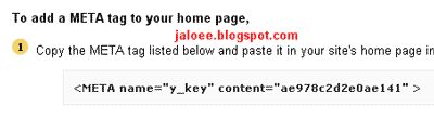 5. Setelah terbuka halaman baru, gulung layar pada halaman paling bawah pada tulisan To add a META tag to your home page.kita di beri sebaris Meta Tag untuk di masukan ke dalam template blog kita. Copy meta tag tersebut.