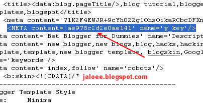 6. Selanjutnya buka blog kita. pada halaman Template -> buka tab Edit Html, Tambahkan atau simpan Meta Tag tersebut ke dalam template kita di bawah tag : <title><data:blog.pageTitle/></title> ( atau di bawah meta verifikasi dari google ) :